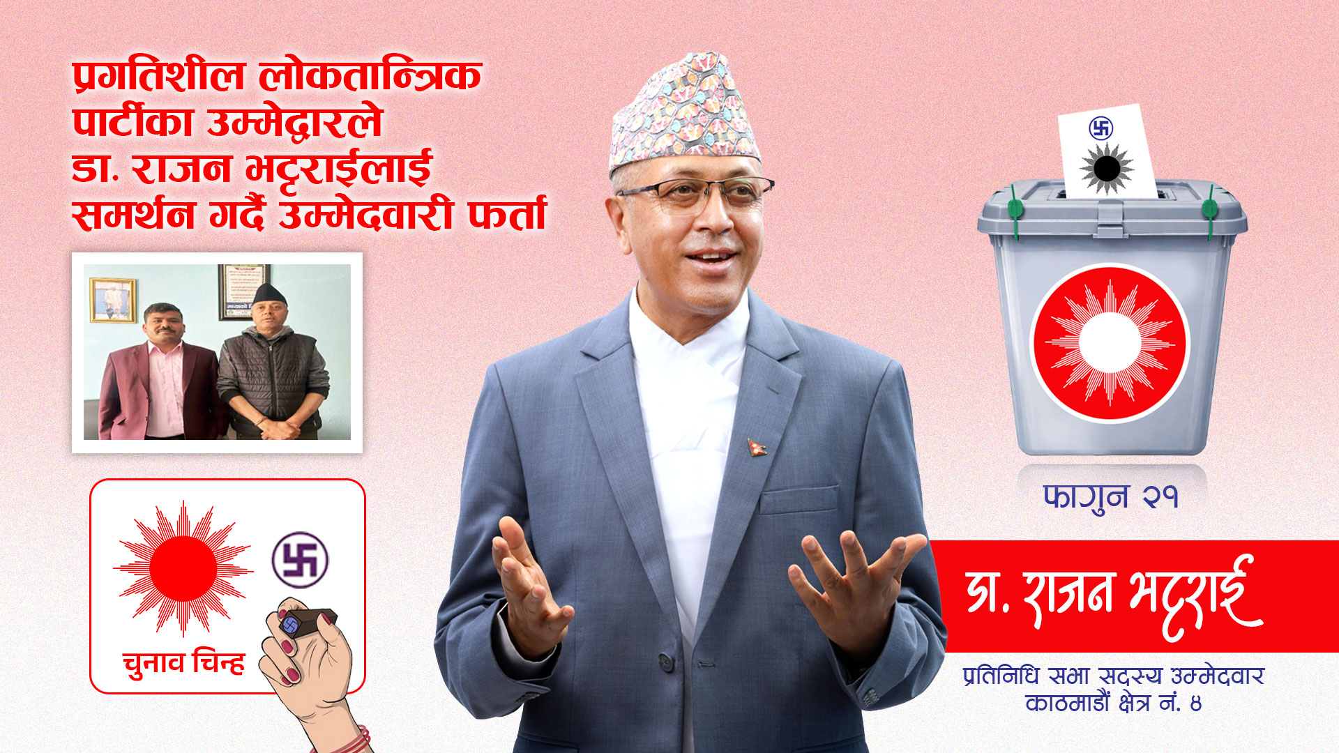 काठमाडौं । काठमाडौं क्षेत्र नं. ४ मा नेकपा एमालेका उम्मेदवार डा.राजन भट्टराई पक्षमा माहोल दरिलो सावित भएको छ । प्रगतिशील लोकतान्त्रिक पार्टीका उम्मेद्वार दत्त बुढाले डा. राजन भट्टराईलाई सहयोग गर्ने