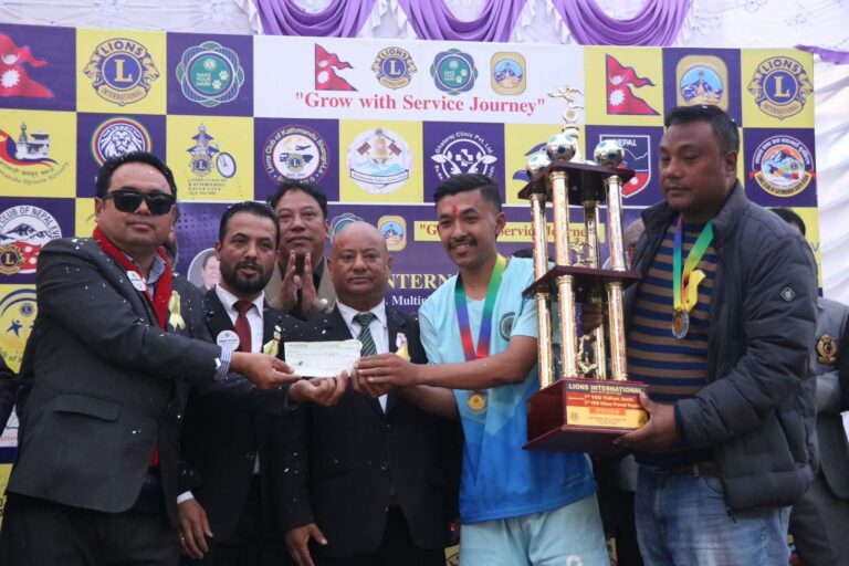 काठमाडौं । लायन्स गभर्नर्स कप फुटसल प्रतियोगितामा ३२ टिम सहभागी हुने भएका छन् । कुपन स्पोर्ट्स सेन्टरमा मंगलबार सम्पन्न फाइनल खेलमा डिष्ट्रिक डि ले डिष्ट्रिक इ लाई ० का विरुद्ध १ गोलले पराजित गर्दै उपाधी हात पारेको हो । उपाधी संगै विजेता टिमले नगद ५० हजार तथा दोस्रो हुने टिमले २५ हजार प्राप्त गरेको थियो । प्रतियोगिताको सर्वोत्कृष्ट खेलाडी आशिष कपाली घोषित भएका थिए ।