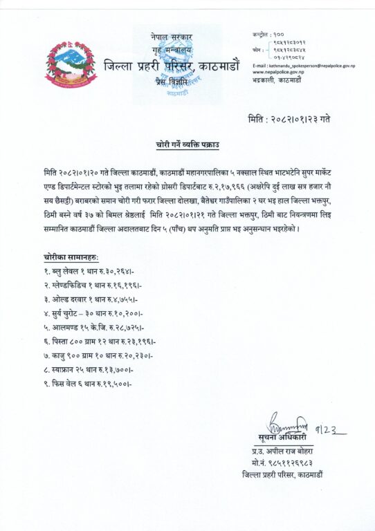 मिति २०८२।०१।२० गते काठमाडौं जिल्ला, काठमाडौं महानगरपालिका–५, नक्सालस्थित भाटभटेनी सुपर मार्केट एण्ड डिपार्टमेन्टल स्टोरको ग्रोसरी डिपार्टमेन्ट (भुइँतलामा) बाट रु. २,१७,९६६ (अक्षरेपी: दुई लाख सत्र हजार नौ सय छैसट्ठी) बराबरको सामान चोरी गरी फरार भएका जिल्ला दोलखा, बैतेश्वर गाउँपालिका–२ निवासी तथा हाल भक्तपुर, ठिमी बसोबास गर्दै आएका ३७ वर्षीय विमल श्रेष्ठलाई मिति २०८२।०१।२१ गते भक्तपुर, ठिमीबाट नियन्त्रणमा लिइएको छ।उक्त व्यक्तिविरुद्ध काठमाडौं जिल्ला अदालतबाट ५ (पाँच) दिनको म्याद थप अनुमति प्राप्त गरि आवश्यक अनुसन्धान कार्य जारी छ।बरामद चोरी भएका सामानको विवरणः१. ब्लु लेबल (१ थान) — रु. ३०,२६४२. ग्लेण्डफिडिच (१ थान) — रु. १६,१९६३. ओल्ड दरबार (१ थान) — रु. ४,७५५४. सुर्य चुरोट (३० थान) — रु. १०,२००५. बदाम (१५ के.जि.) — रु. २८,७२५६. पिस्ता (८०० ग्रामका १२ थान) — रु. २३,१९६७. काजु (९०० ग्रामका १० थान) — रु. २०,२३०८. स्याफ्रान (२५ थान) — रु. १३,७००९. फिस वेल (६ थान) — रु. १९,५००