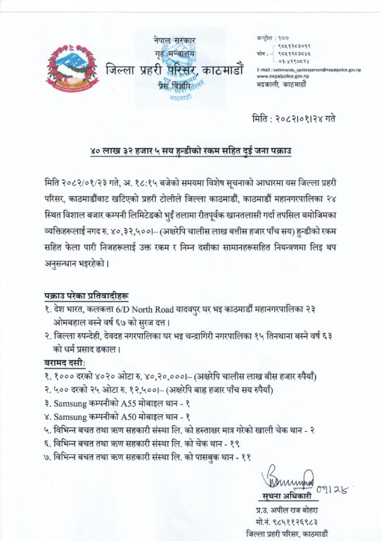 मिति २०८२/०१/२३ गते, साँझ १८:१५ बजे, विशेष सूचनाका आधारमा जिल्ला प्रहरी परिसर, काठमाडौंबाट खटिएको प्रहरी टोलीले काठमाडौं महानगरपालिका–२४ स्थित विशाल बजार कम्पनी लिमिटेडको भुइँ तलामा खानतलासी गर्दा ४० लाख ३२ हजार ५ सय रुपैयाँ नगदसहित दुई जनालाई पक्राउ गरेको छ। पक्राउ परेका व्यक्तिहरू हुन्डी कारोबारमा संलग्न रहेको आशंकामा उनीहरूलाई नियन्त्रणमा लिइ थप अनुसन्धान भइरहेको छ।