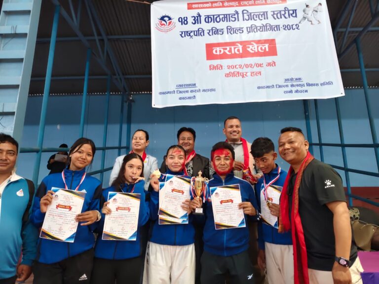 काठमाडौँ जिल्ला स्तरीय राष्ट्रपति रनिङ शिल्ड कराते प्रतियोगिता आज कृतिपुरस्थित कबर्ड हलमा सम्पन्न भएको छ। प्रतियोगितामा कूल १२ स्वर्ण पदकका लागि प्रतिस्पर्धा भएको थियो, जहाँ काठमाडौँ जिल्लाका ८ वटा नगरपालिकाका खेलाडीहरूबीच कडा प्रतिस्पर्धा देखिएको थियो।