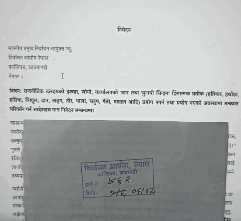 निर्वाचन आयोगमा दर्ता नम्बर ४६२ अनुसार २०८२ असोज २ गते पेश गरिएको निवेदनमार्फत हतियार वा हिंसात्मक प्रतीक (हतौडा, हसिया, त्रिशूल, खड्ग, तीर, भाला, धनुष, गैंती, मशाल आदि) राजनीतिक दलका चिन्ह, झण्डा, लोगो तथा कार्यालयको छापमा प्रयोग नगर्न माग गरिएको हो।
