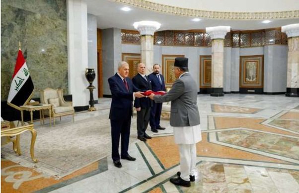 काठमाडौँ । इराकका लागि नेपालका राजदूत घनश्याम लम्सालले इराकका राष्ट्रपति डा. अब्दुल्लातिफ जमाल रसिदसमक्ष आफ्नो ओहोदाको प्रमाणपत्र प्रस्तुत गरेका छन् । बुधबार बग्दादस्थित राष्ट्रपति भवनमा आयोजित विशेष समारोहमा उनले प्रमाणपत्र पेश गरेका हुन् ।