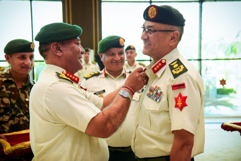 काठमाडौँ । प्रधान सेनापति महारथी अशोकराज सिग्देलले रथी पदमा पदोन्नति भएका उपरथी गणेशकुमार श्रेष्ठलाई रथी दर्जाको चिन्ह प्रदान गरेका छन् । पदोन्नति कार्यक्रम आज कात्तिक २ गते नेपाली सेनाको मुख्यालयमा सम्पन्न भएको हो ।