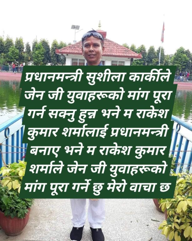 स्वतन्त्र नागरिक राकेश कुमार शर्माले भने आफू जेन जेडी युवाहरूका माग पूरा गर्न सक्षम रहेको दाबी गरेका छन् । उनले भने, “यदि प्रधानमन्त्री सुशीला कार्कीले माग पूरा गर्न सक्दिनन् भने मलाई प्रधानमन्त्री बनाएँ भने म ती मागहरू पूरा गर्नेछु, यो मेरो वाचा हो।”