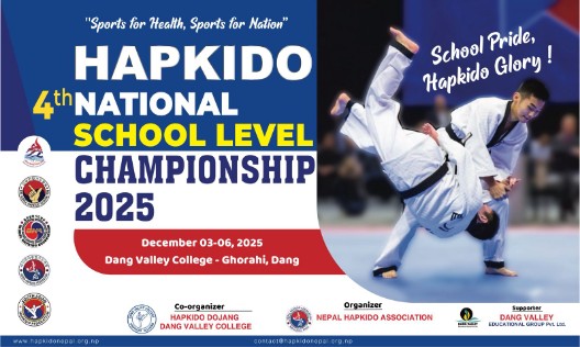 नेपाल हाप्किडो संघको आयोजनामा चौथो राष्ट्रिय स्कुलस्तरीय हाप्किडो प्रतियोगिता–२०८२ मंसिर १६ देखि २० गतेसम्म दाङको घोराहीमा आयोजना हुने भएको छ ।
