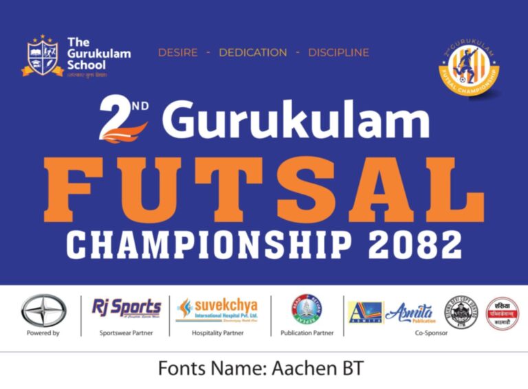 काठमाडौँ । द गुरुकुलम स्कुलको आयोजनामा दोस्रो गुरुकुलम इन्टर स्कुल फुटसल च्याम्पियनसिप कात्तिक २६ गतेदेखि सुरु हुने भएको छ । प्रतियोगिता सितापाइलास्थित द गुरुकुलम स्कुलको फुटसल ग्राउन्डमा कात्तिक २६ र २७ गते दुई दिनसम्म सञ्चालन हुनेछ ।