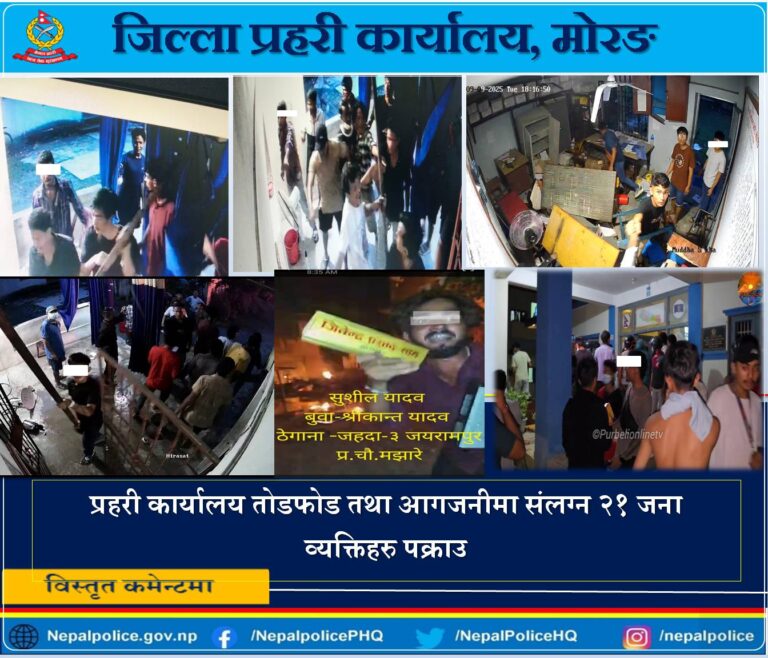 जिल्ला प्रहरी कार्यालय मोरङले भदौ २३ र २४ गतेका दिन भएको जेन–जेड आन्दोलनका क्रममा विभिन्न सार्वजनिक सम्पत्तिमा तोडफोड तथा आगजनी गर्ने कार्यमा संलग्न रहेको आरोपमा २१ जनालाई पक्राउ गरेको छ। प्रहरीका अनुसार आन्दोलनमा केही उच्छृंखल तथा अपराधिक समूहको घुसपैठ भएको प्रारम्भिक अनुसन्धानले पुष्टि गरेको छ।