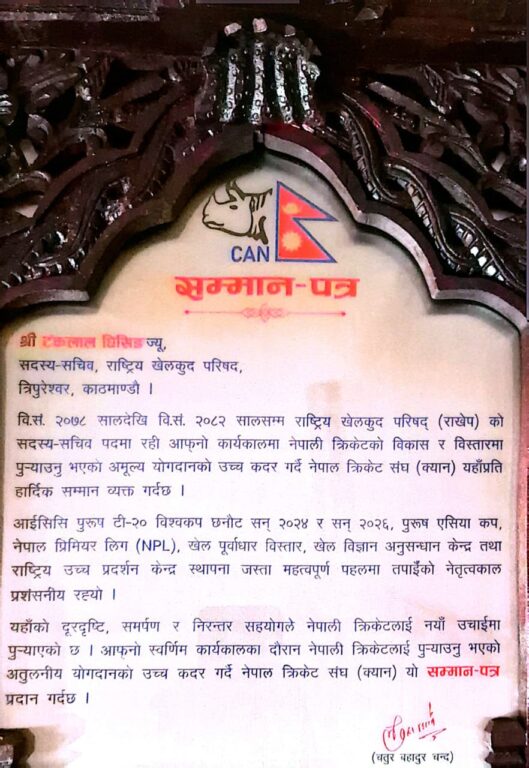 नेपाल क्रिकेट संघ (क्यान) ले राष्ट्रिय खेलकुद परिषद् (राखेप) का सदस्य–सचिव टंकलाल घिसिङलाई सोमबार विशेष सम्मान प्रदान गरेको छ। २०७८ मंसिर दोस्रो साता सदस्य–सचिवमा नियुक्त घिसिङले चार वर्षे कार्यकालमा नेपाली क्रिकेट सहित समग्र खेलकुद विकासमा पु¥याएको महत्वपूर्ण भूमिकाको कदर गर्दै क्यानले सम्मान गरेको हो।