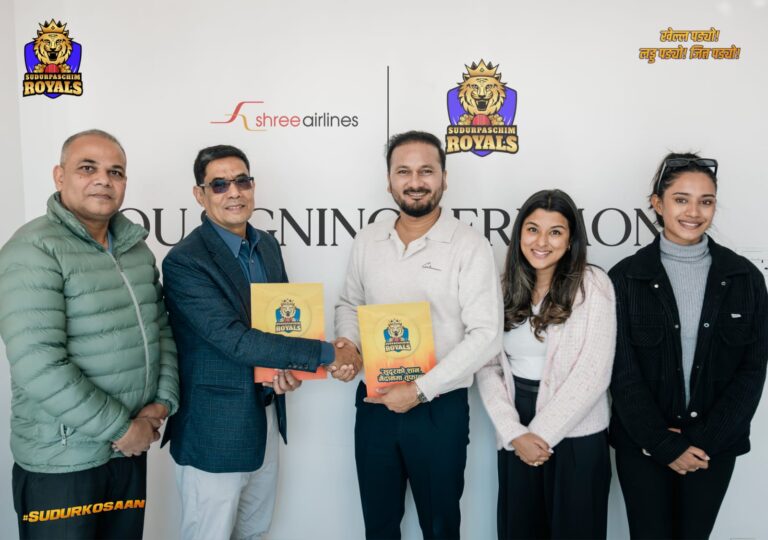 काठमाडौँ । श्री एयरलाइन्स दोस्रो संस्करणको नेपाल प्रिमियर लिग (एनपीएल) मा सुदूरपश्चिम रोयल्सको ‘डोमेस्टिक एयरलाइन्स पार्टनर’ बनेको छ। शुक्रबार काठमाडौँमा सम्पन्न कार्यक्रममा सुदूरपश्चिम रोयल्सका प्रमुख कार्यकारी अधिकृत प्रकाश खड्का र श्री एयरलाइन्सका कर्पोरेट निर्देशक अनिल मानन्धरबीच सम्झौतापत्रमा हस्ताक्षर भएको हो।