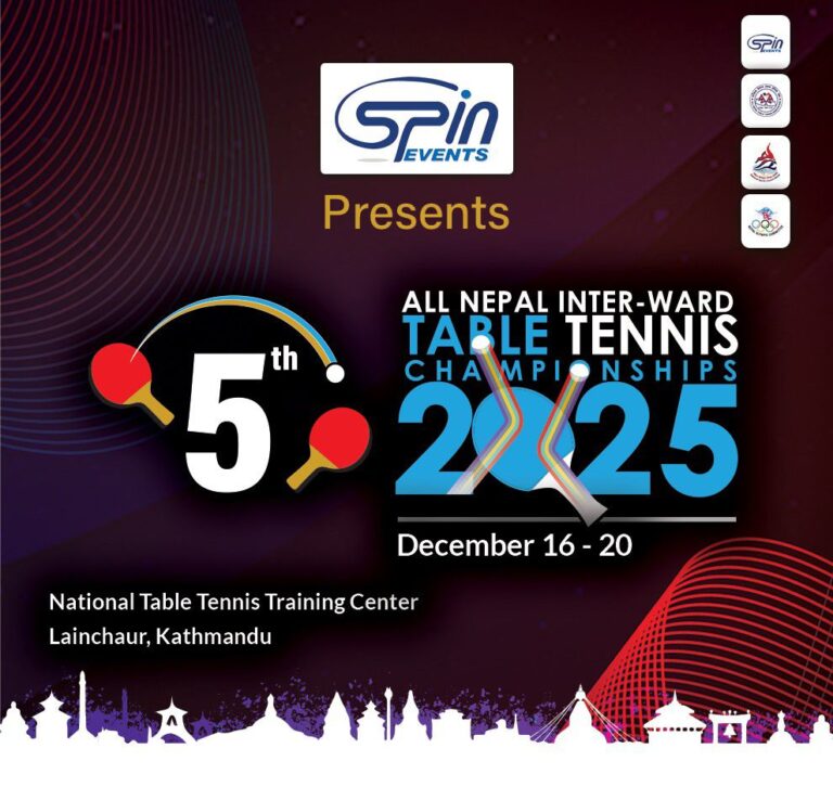 अखिल नेपाल टेबलटेनिस संघको तत्वावधान तथा स्पिन इभेन्ट्स प्रा.लि.को आयोजनामा पाँचौँ देशव्यापी अन्तर वडा टेबलटेनिस प्रतियोगिता पुस १ गतेदेखि सुरू हुने भएको छ।