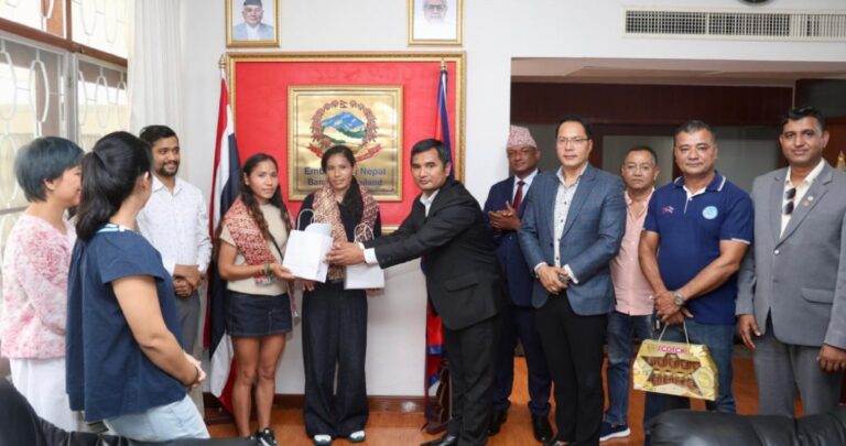 काठमाडौँ । थाइल्यान्डको चर्चित पर्यटकीय तथा साहसिक खेलकुद गन्तव्य च्याङ्गमाईमा हालै सम्पन्न विश्वप्रसिद्ध अन्तर्राष्ट्रिय ट्रेल रन प्रतियोगितामा उत्कृष्ट प्रदर्शन गरेका नेपाली धावकद्वय सनमाया बुढा र रनमाया बुढालाई नेपाली राजदूतावास, बैङ्ककले सम्मान गरेको छ।