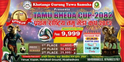 काठमाडौं।खोटाङ्गे गुरुङ युवा समूह, काठमाडौंको आयोजनामा पहिलो राष्ट्रिय तमू भेडा कप फुटबल प्रतियोगिता आगामी बिहीबारदेखि सुरु हुने भएको छ। सेभेन–ए–साइड स्वरूपको प्रतियोगितामा देशभरका गुरुङ समुदायका २६ टोलीले सहभागिता जनाउनेछन्। आयोजक