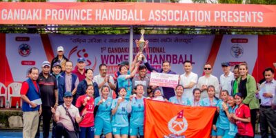 पोखरा, असार १४ पोखरामा सम्पन्न गण्डकी कप राष्ट्रिय महिला ह्याण्डबल प्रतियोगिताको उपाधि एपिएफ क्लबले हात पार्न सफल भएको छ। पोखरा रंगशालास्थित ह्याण्डबल कोर्टमा शनिबार भएको फाइनल खेलमा एपिएफले त्रिभुवन आर्मी