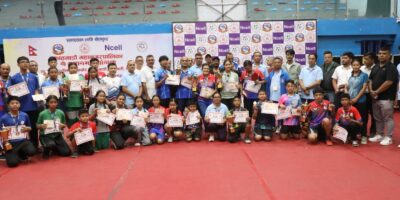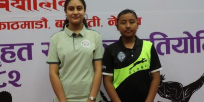 काठमाडौं, जेठ ३१ काठमाडौं जिल्लाव्यापी वृहत खेलकुदअन्तर्गत टेबलटेनिस स्पर्धामा काठमाडौं महानगरपालिका–१७ की प्राज्ना महर्जन र वडा नं. ११ की अन्शु खनालले शनिबार स्वर्ण पदक जिते। लैनचौरस्थित राष्ट्रिय टेबलटेनिस प्रशिक्षण केन्द्रमा