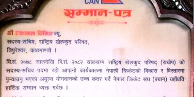 काठमाडौं, मंसिर १ ।नेपाल क्रिकेट संघ (क्यान) ले राष्ट्रिय खेलकुद परिषद् (राखेप) का सदस्य–सचिव टंकलाल घिसिङलाई सोमबार विशेष सम्मान प्रदान गरेको छ। २०७८ मंसिर दोस्रो साता सदस्य–सचिवमा नियुक्त घिसिङले चार