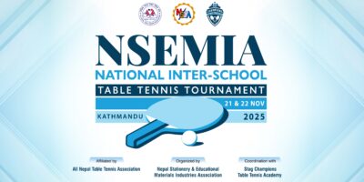 काठमाडौं ।नेपाल मसलन्द तथा शैक्षिक सामग्री उद्योग संघ (एनएसइएमआईए) द्वारा आयोजना हुने राष्ट्रव्यापी अन्तरविद्यालय टेबलटेनिस प्रतियोगिता शुक्रबारदेखि सुरु हुने भएको छ। यू–१२ र यू–१६ ब्वाइज र गल्र्स गरी ४ विधामा